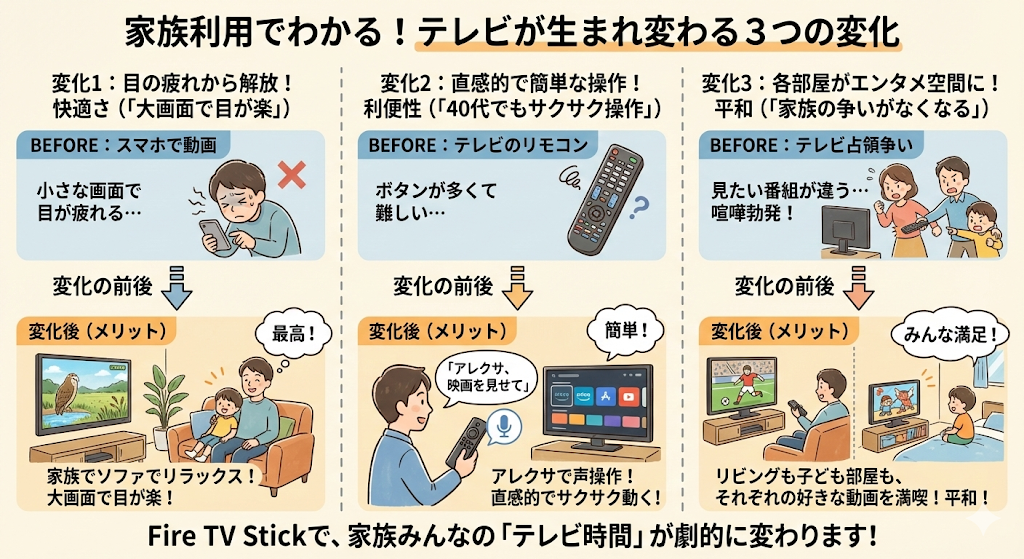 以前はスマホで動画を見ていたので、通知が来るたびに動画が止まったり、目が疲れたりしていました。テレビで見ると、画面が遠いので目が楽ですし、何より「家族で同じものを見て笑える」という時間が戻ってきました。