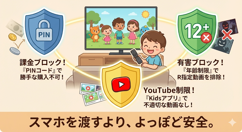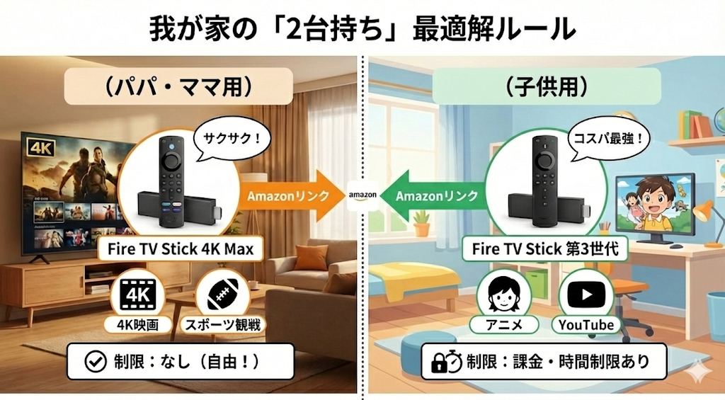 解決策として「子供部屋(または古いテレビ)に2台目のFire TV Stickを導入する」のが最強の手段ですが、そこでよぎるのが「安全性」の不安です。