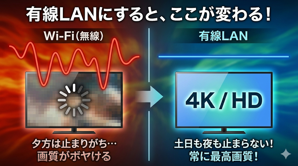 - 動画が止まらなくなる: 無線のような不安定さがゼロになります。