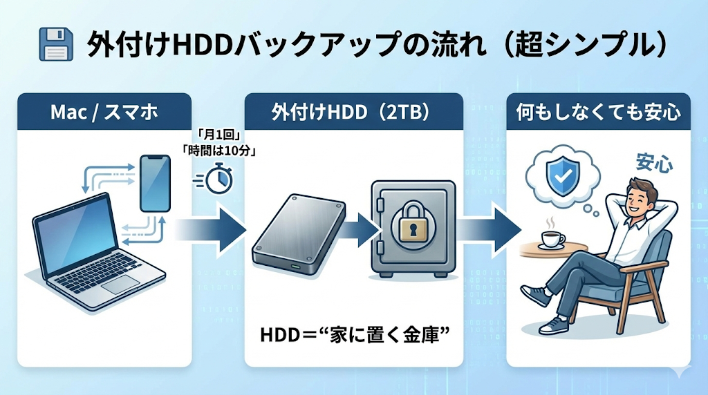 HDDだけだと、正直「物理的に壊れたら終わり」という不安が残ります。