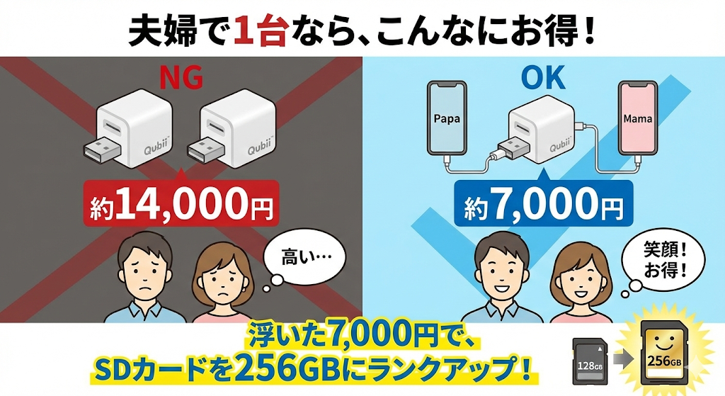 正直、毎回カードを差し替えるくらいなら、最初からQubiiを2台買ったほうが幸せになれます。 「共有するなら、プライバシーより利便性」と割り切りましょう。